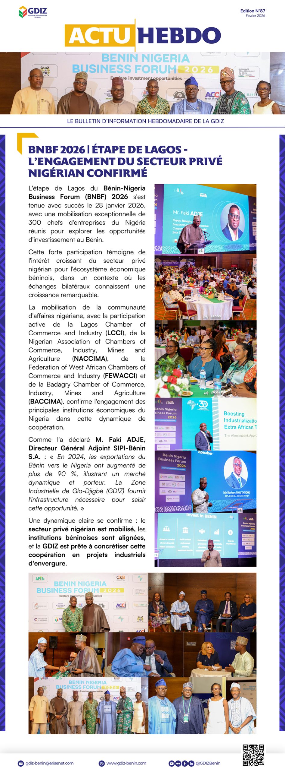 Comme l’a déclaré M. Faki ADJE, Directeur Général Adjoint SIPI-Bénin S.A. : « En 2024, les exportations du Bénin vers le Nigeria ont augmenté de plus de 90 %, illustrant un marché dynamique et porteur. La Zone Industrielle de Glo-Djigbé (GDIZ) fournit l’infrastructure nécessaire pour saisir cette opportunité. »