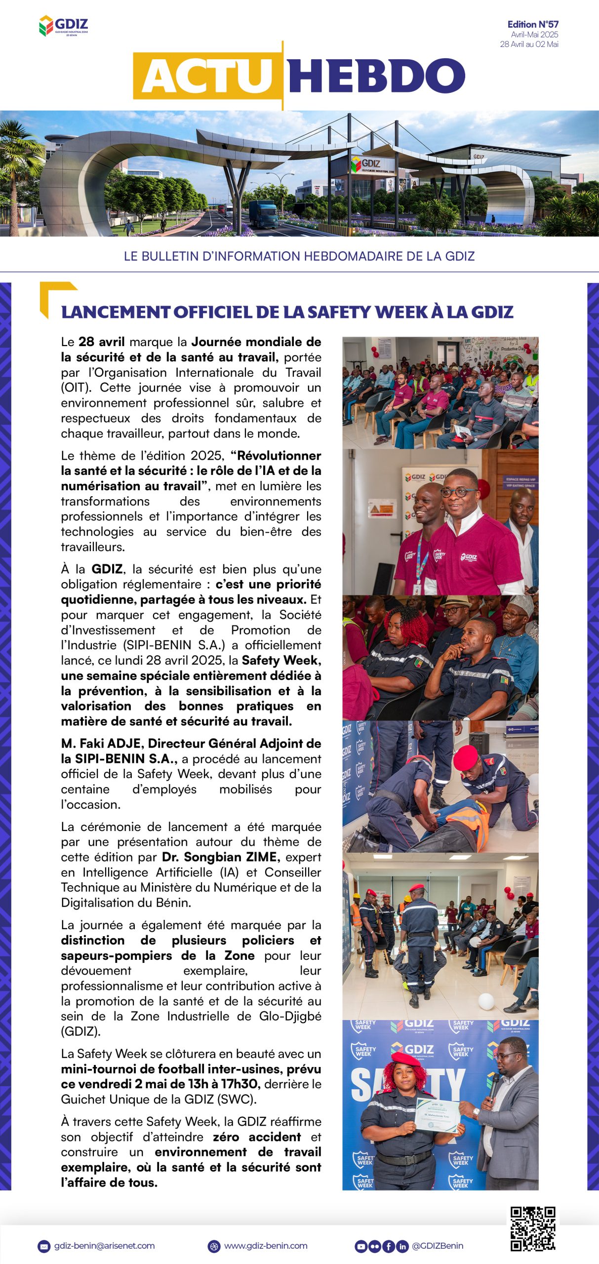 À la GDIZ, la sécurité est bien plus qu’une obligation réglementaire : c’est une priorité quotidienne, partagée à tous les niveaux. Et pour marquer cet engagement, la Société d’Investissement et de Promotion de l’Industrie (SIPI-BENIN S.A.) a officiellement lancé, ce lundi 28 avril 2025, la Safety Week, une semaine spéciale entièrement dédiée à la prévention, à la sensibilisation et à la valorisation des bonnes pratiques en matière de santé et sécurité au travail.