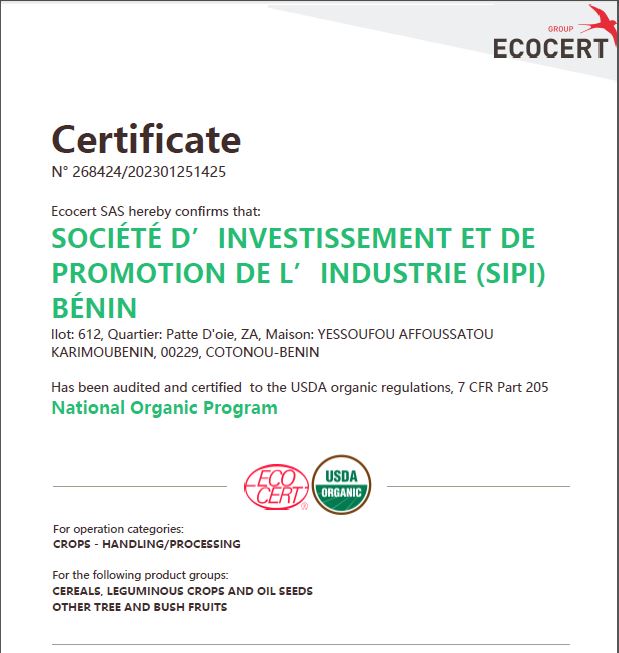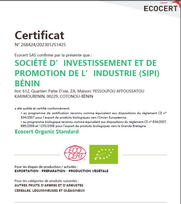 Glo-Djigbé, February 24, 2023 – The Société d’Investissement et de la Promotion de l’Industrie (SIPI-BENIN S.A.), in charge of the development of the Glo-Djigbé Industrial Zone (GDIZ), obtained, on January 25, 2023, the Organic Certification issued by Ecocert (a world leader in organic certification) for production, preparation and export of soybeans and cashew crop, as per Ecocert Organic standard (EOS, European regulation) and National Organic Program (NOP, USDA organic regulations).