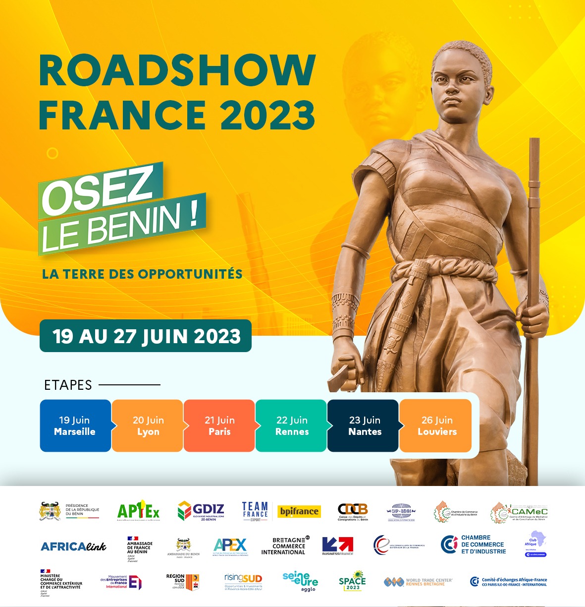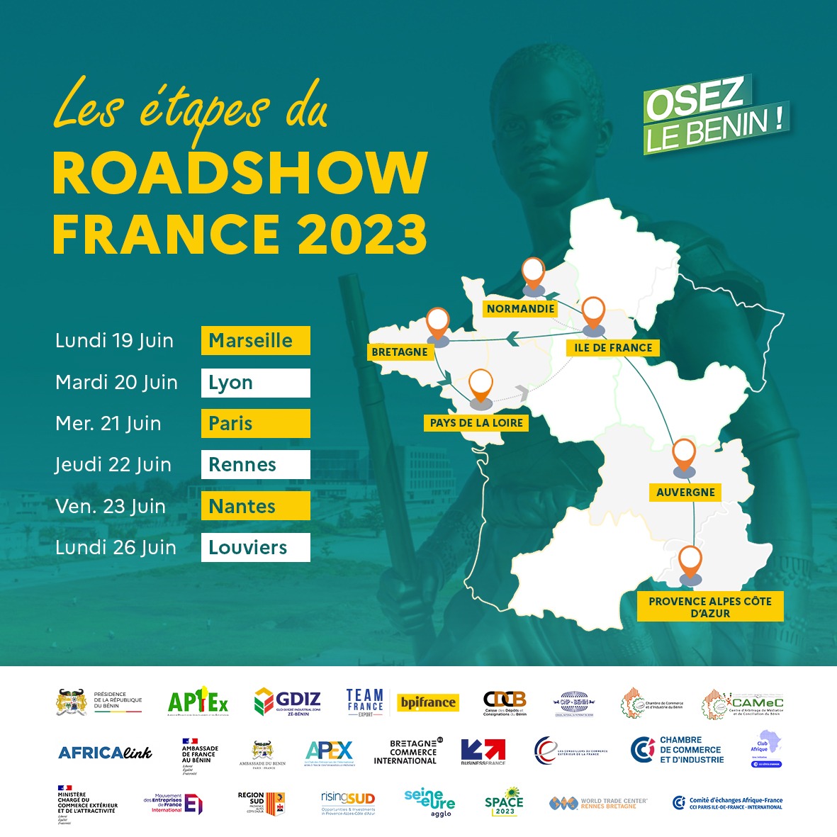 ‘Osez le Bénin! Roadshow France 2023’ will take place from 19th to 27th June 2023 in multiple cities across France. This exclusive event, jointly organized with the Presidency of the Republic of Benin, the Investment and Export Promotion Agency (APIEx), and other key partners, offers a unique opportunity to discover the economic advantages and enticing prospects that Benin offers to French investors.