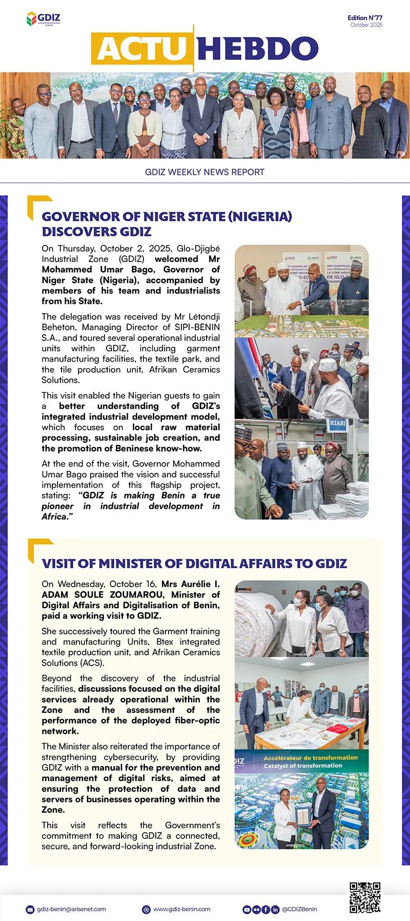 On Thursday, October 2, 2025, Glo-Djigbé Industrial Zone (GDIZ) welcomed Mr Mohammed Umar Bago, Governor of Niger State (Nigeria), accompanied by members of his team and industrialists from his State.